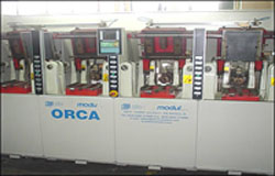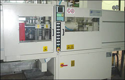 2. Inyección de la Suela: Cada molde es utilizado para la inyección de cada suela, a través de dos Máquinas Orca de cuatro cañones cada una para dos colores y una máquina Clamp de dos cañones para suelas de un solo color. Actualmente se cuenta, con 132 referencias, equivalentes a 606 moldes. La capacidad normal de la fábrica en un año es de 1.180.800 pares de Suelas.